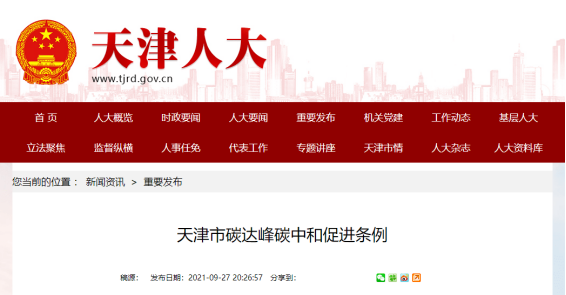 近日,天津市第十七届人民代表大会常务委员会第二十九次会议通过《天津市碳达峰碳中和促进条例》,自2021年11月1日起施行。此条例为全国首个碳达峰碳中和条例,该《条例》以法规形式明确管理体制、基本制度和绿色转型、降碳增汇的政策措施,将为实现天津市“双碳”目标提供坚强法治保障。